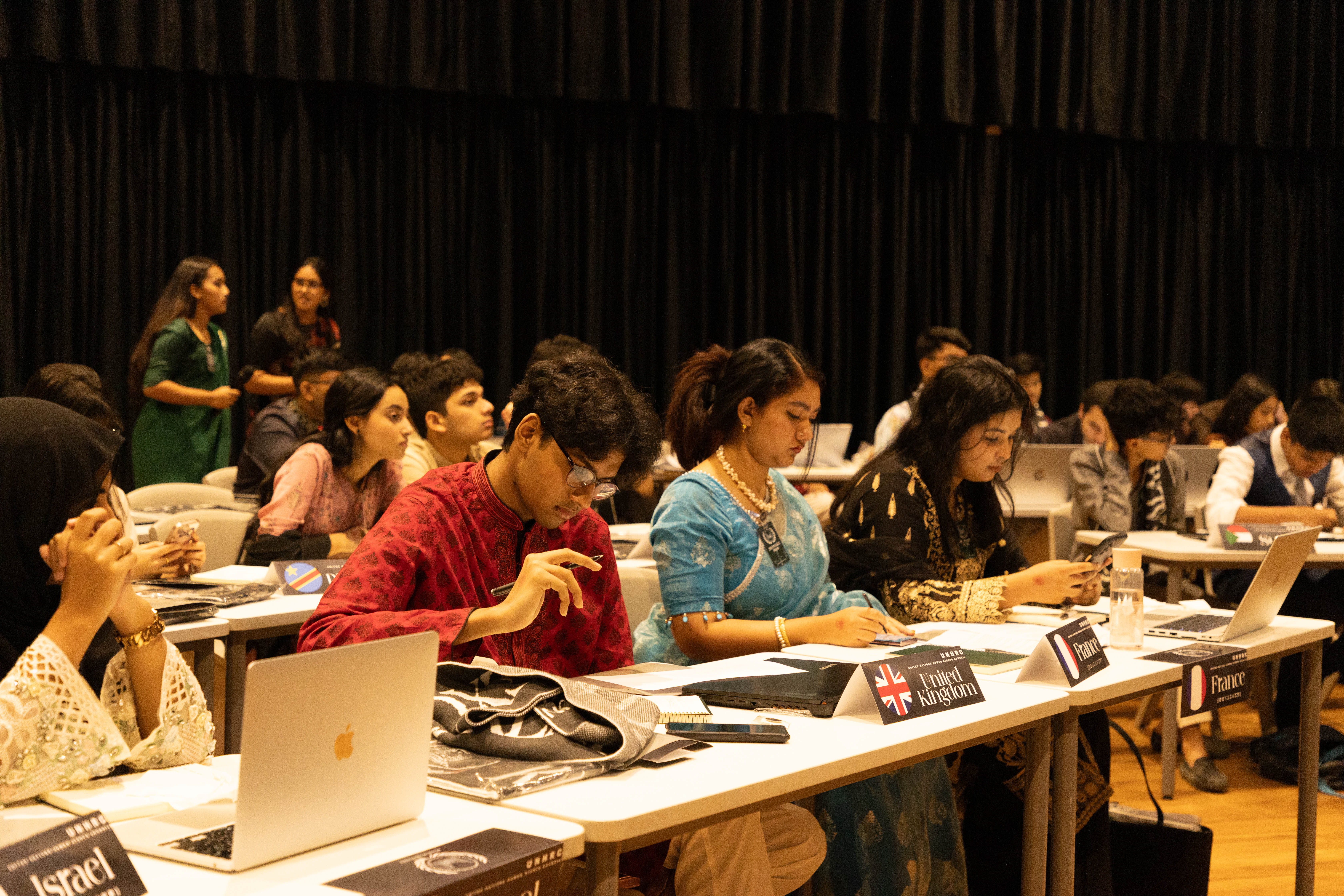 Red, blue, green and purple saris and punjabis filled the halls like a beautiful colour composition. Anxious delegates paced with their faces full of hope, attaching lanyards to their outfits, as placards bearing the flags of different countries lined the rooms. The atmosphere was thick with anticipation, and the sounds of fruitful conversations had already diffused throughout the campus.