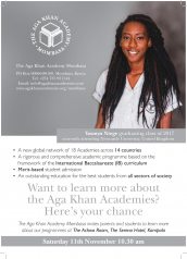 On Saturday the 11 of November, Aga Khan Academy Mombasa will be hosting a session about the Academies, including the rigorous and renowned IB curriculum, the merit-based admission process and much more! Join us at The Achwa Room at The Serena Hotel in Kampala, Uganda at 10:30 am.